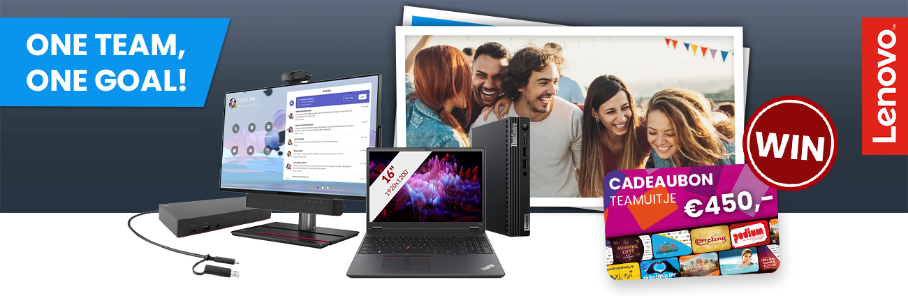 Werk slimmer als één team en vier successen. Koop een Lenovo-product en maak automatisch* kans op een teamuitje ter waarde van €450,-!