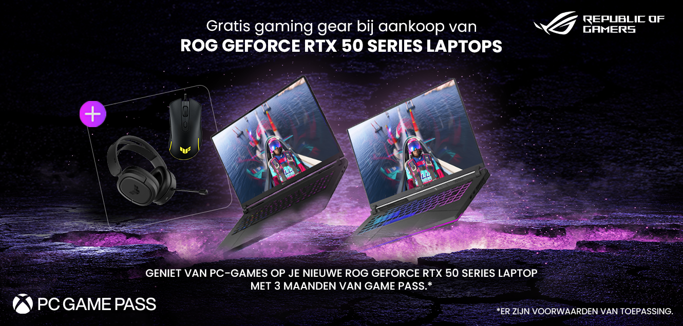 Ontvang een ASUS TUF Gaming H1 Wireless over-ear headset en ASUS TUF Gaming M3 Gen II muis gratis bij aankoop van een ROG GeForce RTX 50 series laptop!